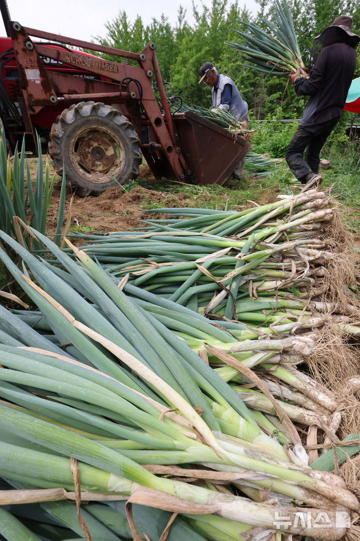 [인천=뉴시스] 전진환 기자 = 24일 오전 인천 남동구의 한 대파농장에서 작업자들이 장마철 집중호우에 대비해 폭염 속 대파를 수확하고 있다. 2025.06.24. [email protected]