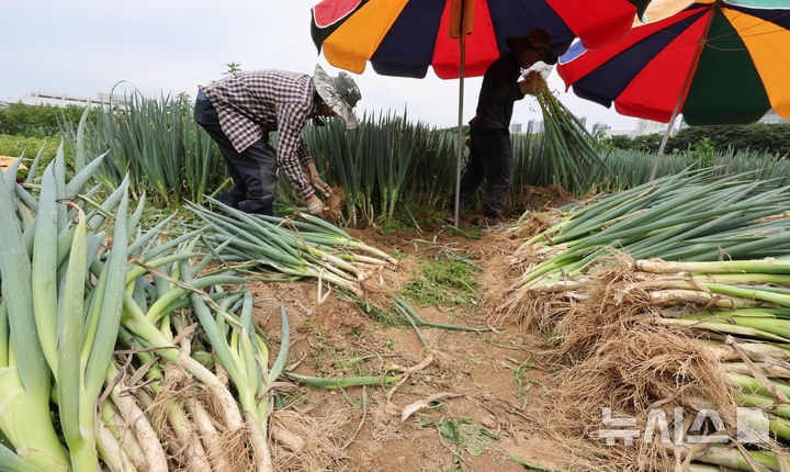 [인천=뉴시스] 전진환 기자 = 24일 오전 인천 남동구의 한 대파농장에서 작업자들이 장마철 집중호우에 대비해 폭염 속 대파를 수확하고 있다. 2025.06.24. [email protected]