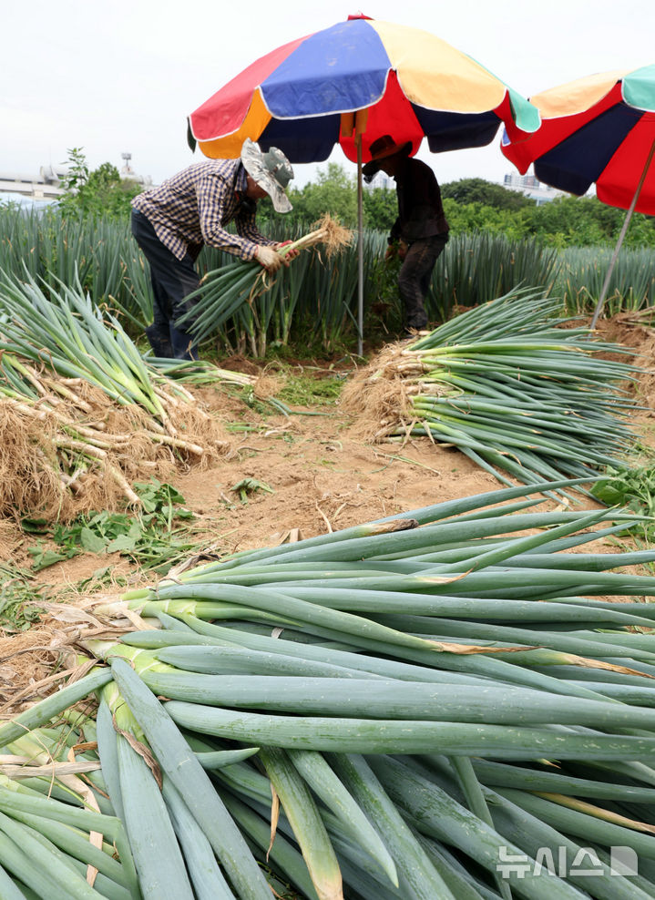 [인천=뉴시스] 전진환 기자 = 24일 오전 인천 남동구의 한 대파농장에서 작업자들이 장마철 집중호우에 대비해 폭염 속 대파를 수확하고 있다. 2025.06.24.  [email protected]