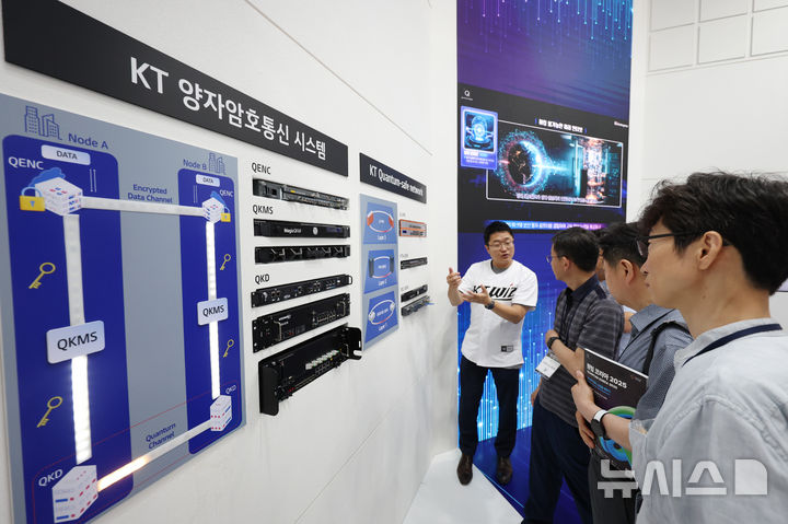 [서울=뉴시스] 김진아 기자 = 24일 서울 서초구 aT센터에서 열린 '퀀텀 코리아 2025'에서 관람객들이 KT의 양자암호통신 시스템에 대한 설명을 듣고 있다. 2025.06.24. [email protected]