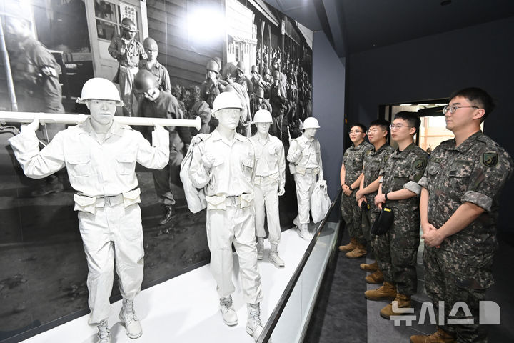 [오산=뉴시스] 김종택 기자 = 6·25 전쟁 75주년을 하루 앞둔 24일 경기 오산시 죽미령 평화공원내 유엔초전기념관을 찾은 육군제 51사단 장병들이 전시물을 살펴보고 있다. 2025.06.24. [email protected]