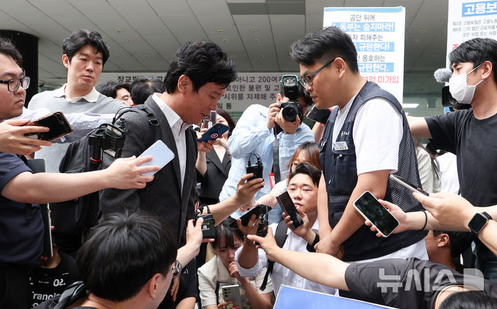 [서울=뉴시스] 김선웅 기자 = 김영훈 고용노동부 장관 후보자가 24일 서울 중구 서울지방고용노동청에 마련된 인사청문회 준비 사무실로 출근하며 인근에서 집회 중인 금속노조 김정봉 금속노조 서울지부 동부지역 부지회장 등 주얼리 노동조합원들과 만나 의견을 청취하고 있다. 2025.06.24. [email protected]