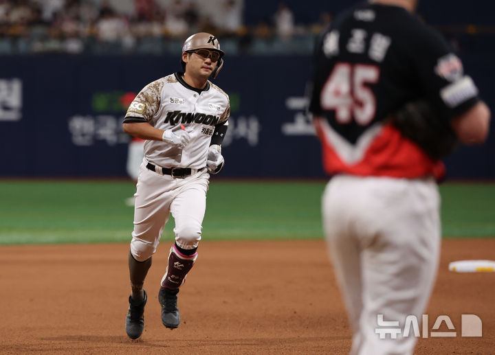 [서울=뉴시스] 배훈식 기자 = 24일 오후 서울 구로구 고척스카이돔에서 열린 2025 신한 쏠뱅크 KBO리그 키움 히어로즈와 기아 타이거즈의 경기, 6회말 1사 1, 2루 상황에서 키움 임치열이 3점 홈런을 쳐낸 뒤 그라운드를 돌고 있다. 2025.06.24. [email protected]