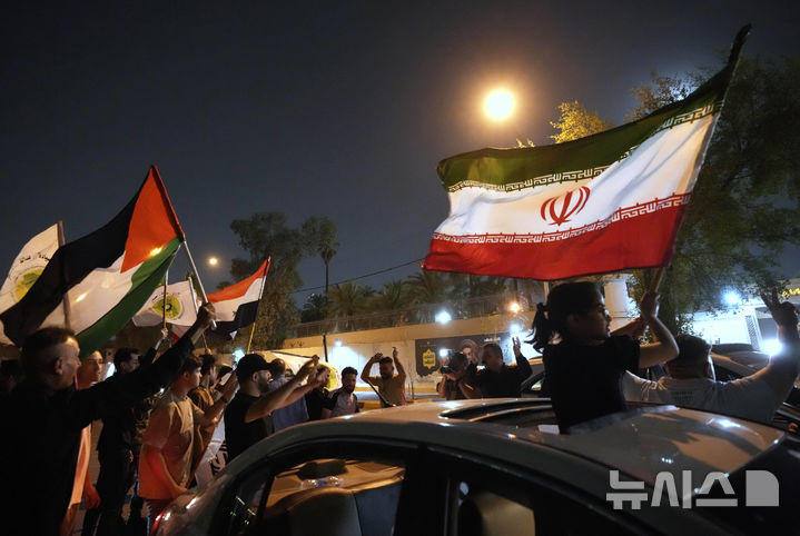 [바그다드=AP/뉴시스] 24일(현지 시간) 이라크 바그다드에서 이란 국기를 든 시위대가 이라크 주재 이란 대사관 앞에 모여 이란과 이스라엘의 휴전을 환영하고 있다. 2025.06.25.