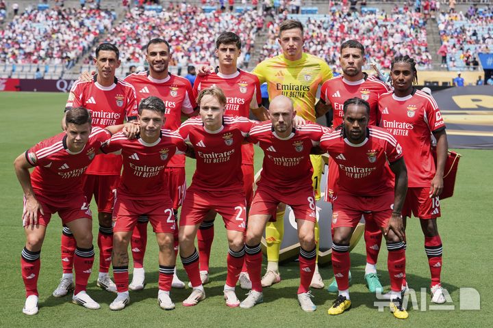 [샬럿=AP/뉴시스] 벤피카(포르투갈) 선수들이 24일(현지 시간) 미 노스캐롤라이나주 샬럿의 뱅크 오브 아메리카 스타디움에서 열리는 2025 국제축구연맹(FIFA) 클럽 월드컵 조별리그 C조 3차전 바이에른 뮌헨(독일)과의 경기를 앞두고 기념 촬영하고 있다. 벤피카는 뮌헨에 1-0 승리를 거두고 2승 1무로 조 1위를 기록하며 16강에, 뮌헨은 2승 1패, 조 2위로 16강에 올랐다. 2025.06.25.