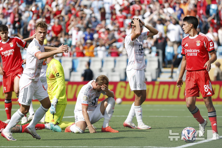 [샬럿=AP/뉴시스] 바이에른 뮌헨(독일)의 해리 케인(가운데)이 24일(현지 시간) 미 노스캐롤라이나주 샬럿의 뱅크 오브 아메리카 스타디움에서 열린 2025 국제축구연맹(FIFA) 클럽 월드컵 조별리그 C조 3차전 벤피카(포르투갈)와 경기 중 기회를 놓치고 아쉬워하고 있다. 벤피카가 뮌헨에 1-0 승리를 거두고 2승 1무로 조 1위를 기록하며 16강에, 뮌헨은 2승 1패, 조 2위로 16강에 올랐다. 2025.06.25.