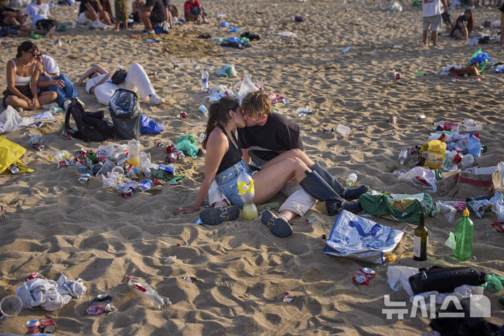 [바르셀로나=AP/뉴시스] 24일(현지 시간) 스페인 바르셀로나 해변에서 '산후안 축제'를 즐기던 연인이 일출을 기다리면서 입 맞추고 있다. 이 축제는 세례 요한 축일을 기념해 23일 밤부터 24일 새벽까지 열리며, 하지(夏至)와 가까운 시기에 개최돼 태양의 힘이 최고조에 이르는 시점을 기념하고 여름의 시작을 알리는 중요한 행사로 자리 잡았다. 2025.06.25.