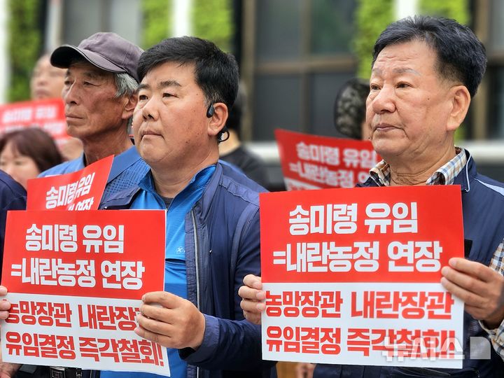 [청주=뉴시스] 이도근 기자= 전국농민회총연맹 충북도연맹 등 농민단체 회원과 진보당 당원들이 25일 충북 청주시 상당구 문화동 충북도청에서 송미령 농림축산식품부 장관의 유임 철회를 촉구하는 기자회견을 하고 있다. 2025.06.25. [email protected]