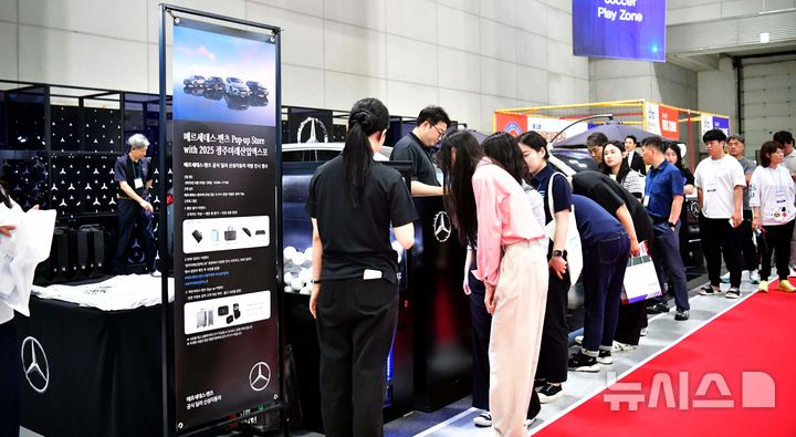 [광주=뉴시스] 이현행 기자 = 25일 오후 광주 서구 김대중컨벤션센터에서 열린 2025 광주미래산업엑스포에 참여한 관람객들이 메르세데스 벤츠 부스 관람을 위해 줄 서고 있다. 2025.06.25 [email protected]