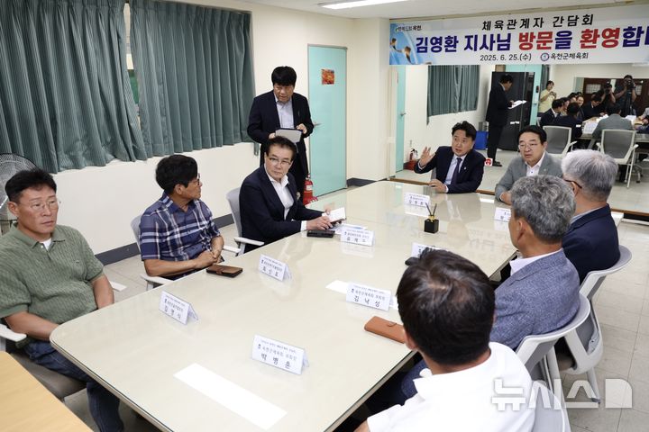 [옥천=뉴시스] 25일 11개 시군 중 마지막 순방지 옥천군을 방문한 김영환 충북지사가 옥천군체육센터에서 체육분야 관계자 10여 명과 다목적체육센터 활용 방안과 생활체육 활성화 방안을 논의하고 있다. (사진=충북도 제공) 2025.06.25. [email protected]