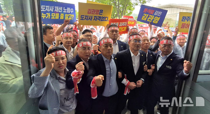 [완주=뉴시스] 김얼 기자 = 완주-전주 통합을 반대하는 완주군의회 의원들이 25일 전북 완주군 완주군청 입구에서 군민과의 대화를 위해 찾은 김관영 전북특별자치도지사의 완주군청 방문을 거부하며 농성을 펼치고 있다. 2025.06.25. [email protected]