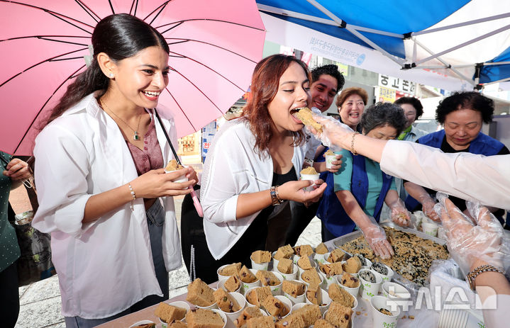 [대구=뉴시스] 이무열 기자 = 25일 대구 중구 동성로에서 열린 6·25전쟁 당시 음식 재현 무료 시식회에서 외국인 관광객들이 보리빵을 시식하고 있다. 2025.06.25. [email protected]