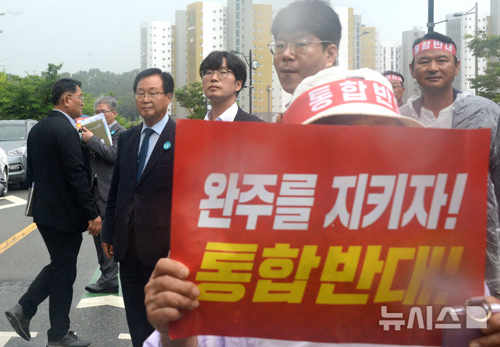 [완주=뉴시스] 김얼 기자 = 유희태(왼쪽 두번째) 완주군수가 25일 전북 완주군 완주군청을 방문한 김관영 전북특별자치도지사의 배웅을 위해 대기하고 있다. 2025.06.25. [email protected]