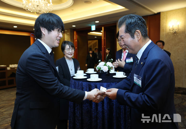[서울=뉴시스] 국회사진기자단 = 정청래 더불어민주당 의원과 하정우 대통령실 AI미래기획수석이 25일 서울 중구 롯데호텔에서 열린 2025 경향포럼에서 인사하고 있다. 2025.06.25. [email protected]