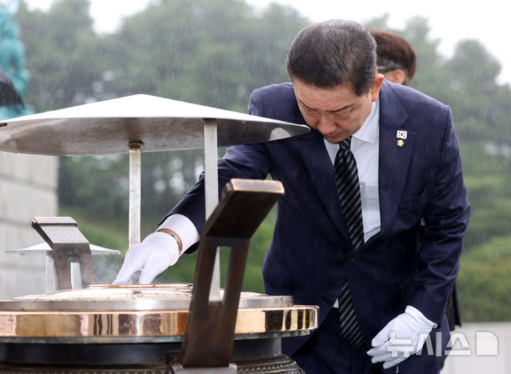 [대전=뉴시스] 김명년 기자 = 김병기 더불어민주당 대표 직무대행 겸 원내대표가 25일 대전 유성구 국립대전현충원 현충탑을 참배하고 있다. 2025.06.25. [email protected]
