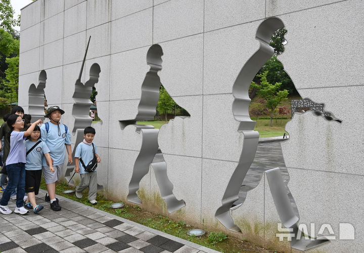 [오산=뉴시스] 김종택 기자 = 6·25 전쟁 75주년인 25일 경기 오산시 죽미령 평화공원을 찾은 학생들이 유엔스미스 특수임무대의 행군 모습이 새겨진 조형물 앞을 걷고 있다. 2025.06.25. [email protected]