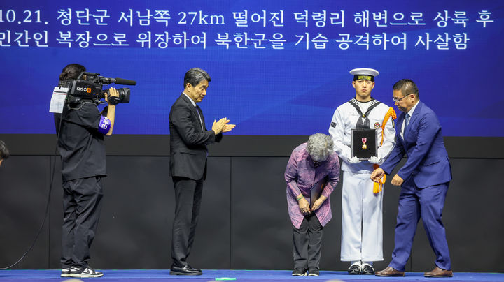 [서울=뉴시스] 이주호 국무총리 직무대행 부총리 겸 교육부 장관이 25일 오전 대전 유성구 대전컨벤션센터에서 열린 6.25전쟁 제75주년 기념식에 참석하여 참전유공자 가족에게 화랑무공훈장을 전수하고 있다. (사진=국가보훈부 제공) 2025.06.25. [email protected] *재판매 및 DB 금지