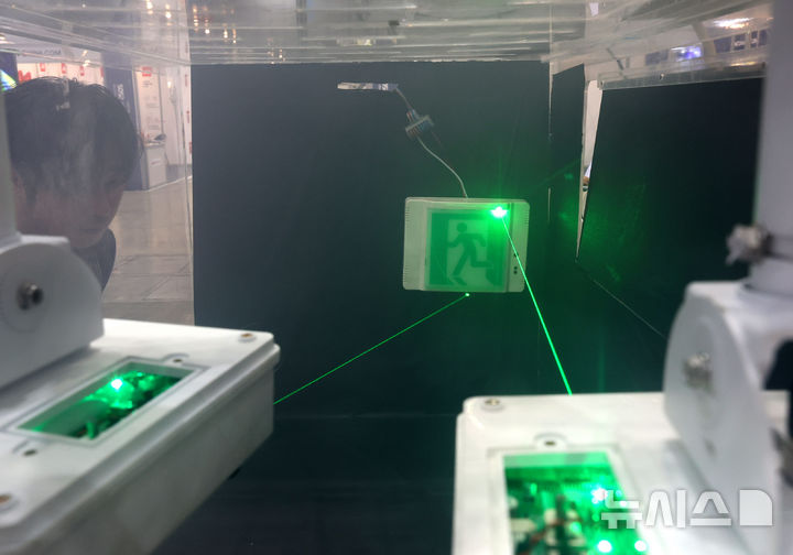 [고양=뉴시스] 전진환 기자 = 25일 경기도 고양시 킨텍스에서 열린 2025 국제광융합엑스포에서 한 관람객이 스마트 레이저 피난 유도기를 살펴보고 있다. 2025.06.25. [email protected]