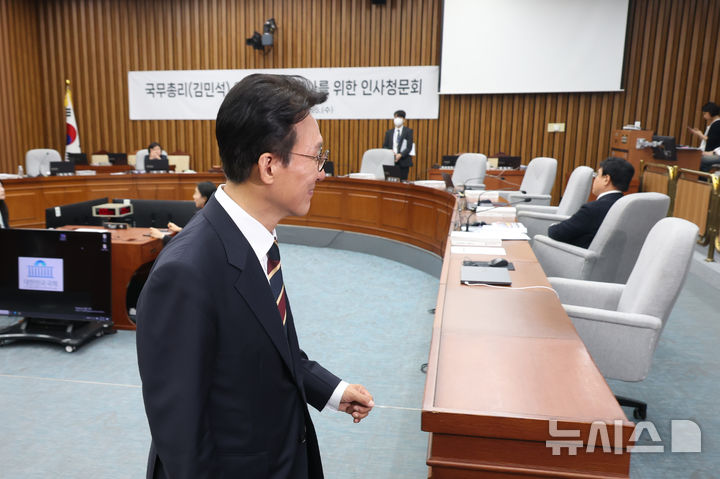 [서울=뉴시스] 고승민 기자 = 25일 서울 여의도 국회에서 열린 김민석 국무총리 후보자 인사청문회에서 국민의힘 의원들이 자료 관련 청문회 참여를 중단하자 이들을 기다리던 김 후보자가 저녁식사를 위해 이동하고 있다. 2025.06.25. [email protected]
