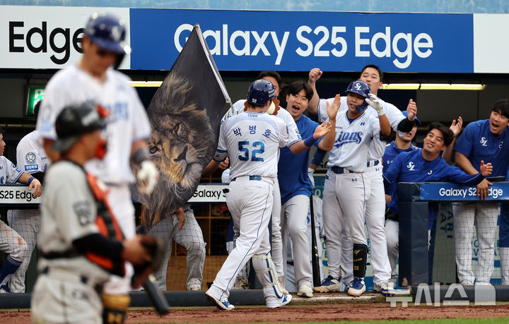 [대구=뉴시스] 이무열 기자 = 25일 대구 수성구 삼성라이온즈파크에서 열린 2025 신한 SOL 뱅크 KBO 리그 한화 이글스와 삼성 라이온즈의 경기, 3회말 무사 주자 없는 상황에서 삼성 박병호가 솔로 홈런을 때린 뒤 더그아웃에 들어서며 동료들과 기뻐하고 있다. 2025.06.25. [email protected]