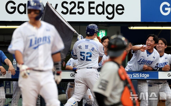 [대구=뉴시스] 이무열 기자 = 25일 대구 수성구 삼성라이온즈파크에서 열린 2025 신한 SOL 뱅크 KBO 리그 한화 이글스와 삼성 라이온즈의 경기, 3회말 무사 주자 없는 상황에서 삼성 박병호가 솔로 홈런을 때린 뒤 더그아웃에 들어서며 동료들과 기뻐하고 있다. 2025.06.25. [email protected]