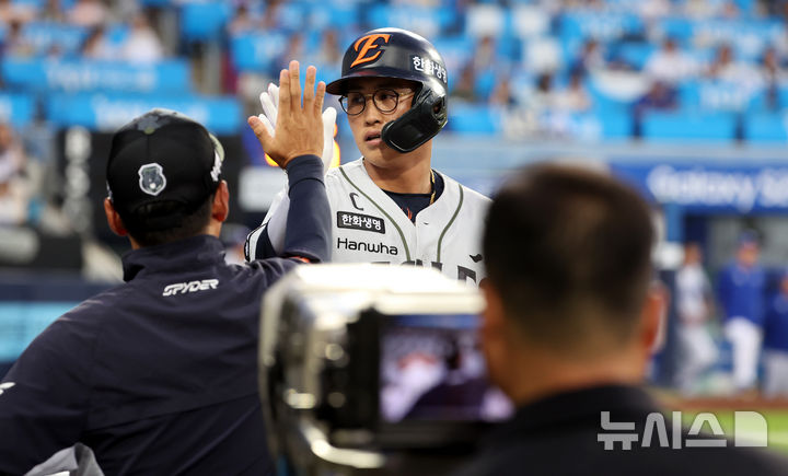 [대구=뉴시스] 이무열 기자 = 25일 대구 수성구 삼성라이온즈파크에서 열린 2025 신한 SOL 뱅크 KBO 리그 한화 이글스와 삼성 라이온즈의 경기, 5회초 무사 주자 없는 상항에서 한화 채은성이 솔로 홈런을 때린 뒤 더그아웃에 들어서며 동료들과 기뻐하고 있다. 2025.06.25. [email protected]
