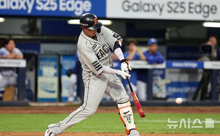 [대구=뉴시스] 이무열 기자 = 25일 대구 수성구 삼성라이온즈파크에서 열린 2025 신한 SOL 뱅크 KBO 리그 한화 이글스와 삼성 라이온즈의 경기, 5회초 무사 주자 없는 상항에서 한화 채은성이 솔로 홈런을 때리고 있다. 2025.06.25. [email protected]