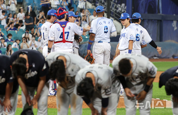 [대구=뉴시스] 이무열 기자 = 25일 대구 수성구 삼성라이온즈파크에서 열린 2025 신한 SOL 뱅크 KBO 리그 한화 이글스와 삼성 라이온즈의 경기, 7-2로 승리한 삼성 선수들이 기뻐하고 있다. 2025.06.25. [email protected]