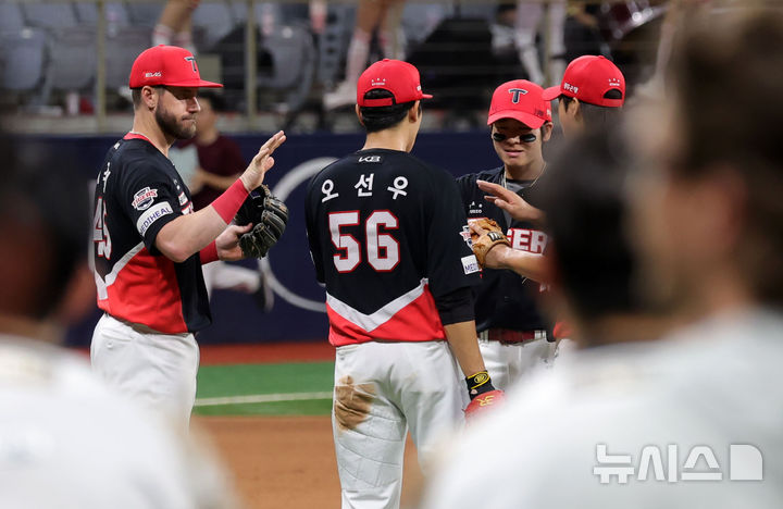 [서울=뉴시스] 홍효식 기자 = 25일 서울 구로구 고척스카이돔에서 열린 2025 KBO리그 KIA 타이거즈와 키움 히어로즈의 경기, 6-3으로 승리한 KIA 선수들이 기뻐하고 있다. 2025.06.25. [email protected]