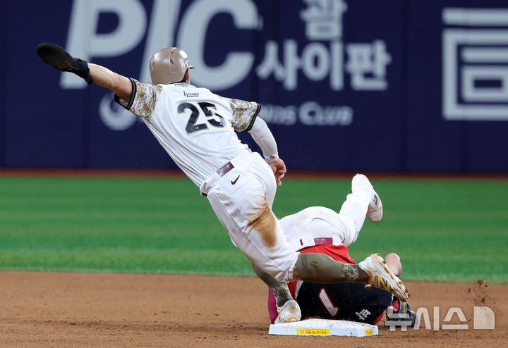[서울=뉴시스] 홍효식 기자 = 25일 서울 구로구 고척스카이돔에서 열린 2025 KBO리그 KIA 타이거즈와 키움 히어로즈의 경기, 9회말 1사 1루 키움 어준서의 타격 때 1루주자 주성원이 2루 베이스를 밟고 3루로 향하고 있다. 2025.06.25. [email protected]