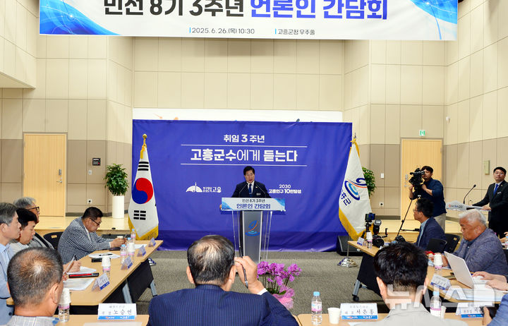 [고흥=뉴시스] 김석훈 기자 = 공영민 전남 고흥군수가 26일 오전 고흥군청 우주홀에서 민선 8기 3주년 언론인 간담회를 하고 있다. 2025.06.26. [email protected]