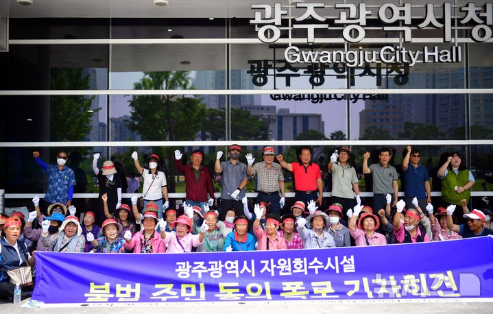 [광주=뉴시스] 이현행 기자 = 삼도소각장반대 대책위원회가 26일 오전 광주 서구 광주시청 앞에서 기자회견을 열어 입지 선정과정에서의 위장전입 의혹을 제기하며 규탄 구호를 외치고 있다. 2025.06.26. [email protected]