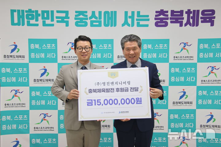 [청주=뉴시스] 윤현우(오른쪽) 충북체육회장과 이경제 영진엔지니어링 대표가 26일 충북체육회관에서 후원 협약식 기념촬영을 하고 있다. 영진엔지니어링은 3년간 1500만원의 체육발전기금을 지원하기로 했다. (사진=충청북도체육회 제공) 2025.06.26. [email protected]
