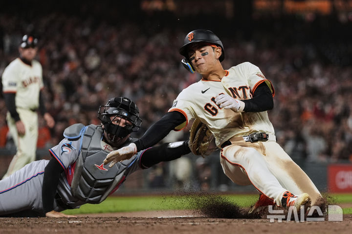 [샌프란시스코=AP/뉴시스] 샌프란시스코 자이언츠의 이정후가 25일(현지 시간) 미 캘리포니아주 샌프란시스코 오라클 파크에서 열린 2025 메이저리그 마이애미 말린스와의 경기 9회 말 볼넷 진루 후 후속 안타에 홈으로 쇄도하다가 태그 아웃되고 있다. 이정후는 1타수 무안타 3사사구 1득점을 기록했고 샌프란시스코는 연장 10회 끝에 5-8로 패했다. 2025.06.26.