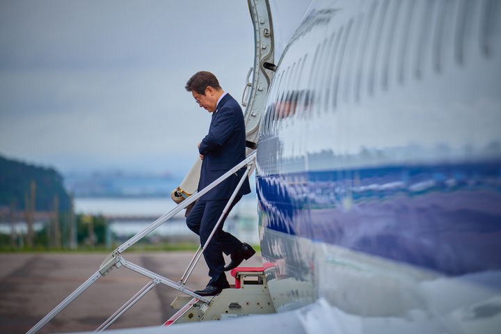 [서울=뉴시스] 호남지역을 방문한 이재명 대통령이 지난 25일 여수공항에 도착해 전용기에서 내리고 있다. (사진=대통령실 제공) 2025.06.26. [email protected] *재판매 및 DB 금지