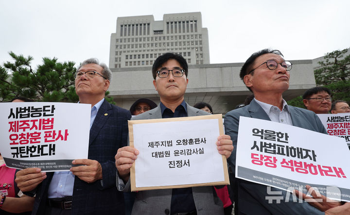 [서울=뉴시스] 권창회 기자 = 공안탄압저지 및 민주수호 제주대책위원회를 미롯한 시민단체 회원들이 26일 오전 서울 서초구 대법원 앞에서 열린 제주지법 오창훈 판사의 불법재판으로 구속된 현은정-현진희 항고심 파기환송 촉구 기자회견에서 진정서를 들고 있다. 2025.06.26. [email protected]