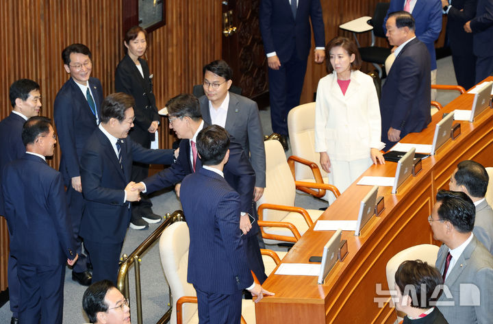 [서울=뉴시스] 국회사진기자단 = 이재명 대통령이 26일 서울 여의도 국회에서 추가경정예산안 시정연설을 마친 뒤 권성동 국민의힘 전 원내대표와 인사를 하고 있다. 2025.06.25. [email protected]