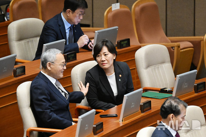 [서울=뉴시스] 국회사진기자단 = 송미령 농림축산식품부 장관이 26일 국회에서 열린 제426회국회(임시회) 제2차 본회의에서 유인촌 문화체육관광부 장관과 대화하고 있다. 2025.06.26. [email protected]