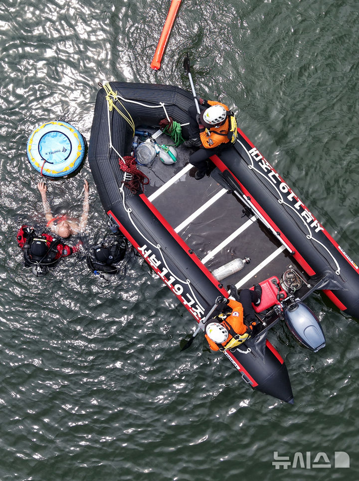 [대구=뉴시스] 이무열 기자 = 26일 대구 달성군 송해공원 옥연지에서 대구서부소방서 119구조대원들이 하계 수난사고 대비 특별구조훈련을 하고 있다. 2025.06.26. [email protected]