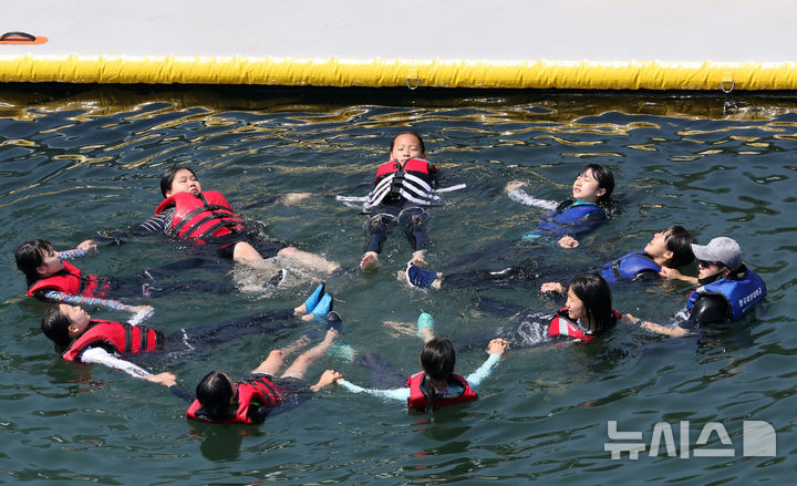 [부산=뉴시스] 하경민 기자 = '2025년 초등학생 바다생존수영 교육과정'이 열린 26일 부산 영도구 한국해양대학교 해상교육장에서 초등학생들이 바다 생존 수영법을 배우고 있다.