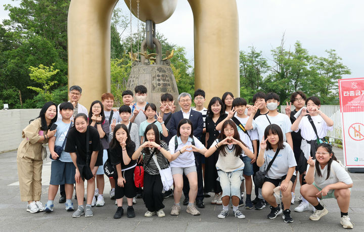 [서울=뉴시스] 정근식 서울시교육감이 26일 경기 김포시 애기봉평화생태공원에서 2025 학교로 찾아가는 통일교육버스 체험에 참여한 서울응봉초 6학년 학생들과 기념촬영을 하고 있다. (사진=서울시교육청 제공) 2025.06.26. [email protected] *재판매 및 DB 금지