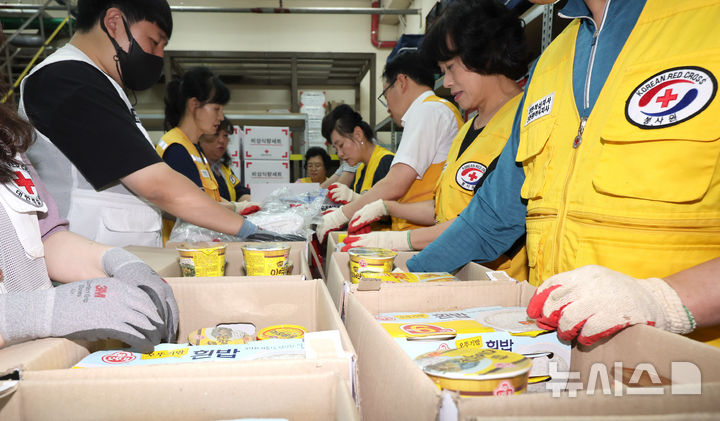 [인천=뉴시스] 전진환 기자 = 26일 오후 인천 연수구 대한적십자사 인천지사에서 직원과 봉사원들이 여름철 풍수해 대비 긴급구호세트 및 비상식량세트를 제작하고 있다. 2025.06.26. [email protected]