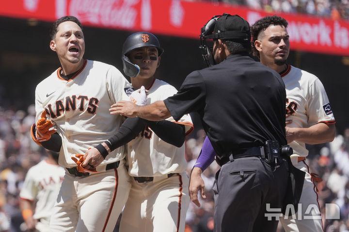 [샌프란시스코=AP/뉴시스] 샌프란시스코 자이언츠의 이정후가 26일(현지 시간) 미 캘리포니아주 샌프란시스코 오라클 파크에서 열린 2025 메이저리그 마이애미 말린스와의 경기 7회 말 윌머 플로레스(왼쪽)가 삼진당한 후 선수 간 충돌이 일어나자 그를 말리고 있다. 이정후는 4타수 1안타 1득점을 기록했고 샌프란시스코는 5-12로 패했다. 2025.06.27.