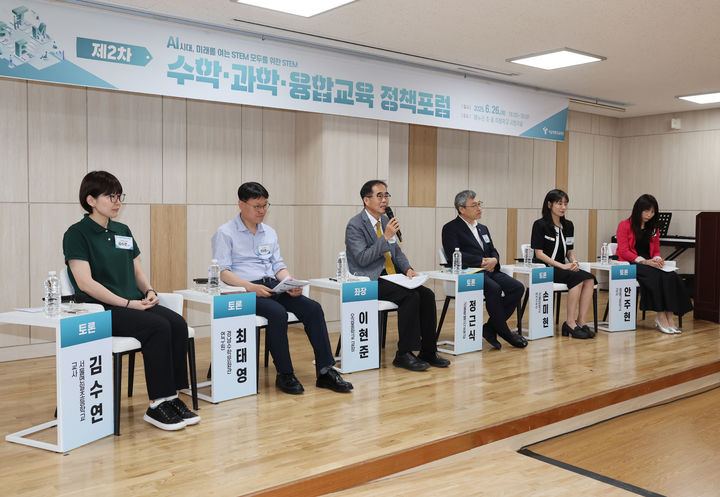 [서울=뉴시스] 정근식(왼쪽 네번쨰) 서울시교육감이 26일 서울 송파구 해누리초·중 이음학교에서 열린 제2차 수학·과학·융합교육 정책포럼에서 종합토론을 하고 있다.(사진=서울시교육청 제공) 2025.06.27. [email protected] *재판매 및 DB 금지