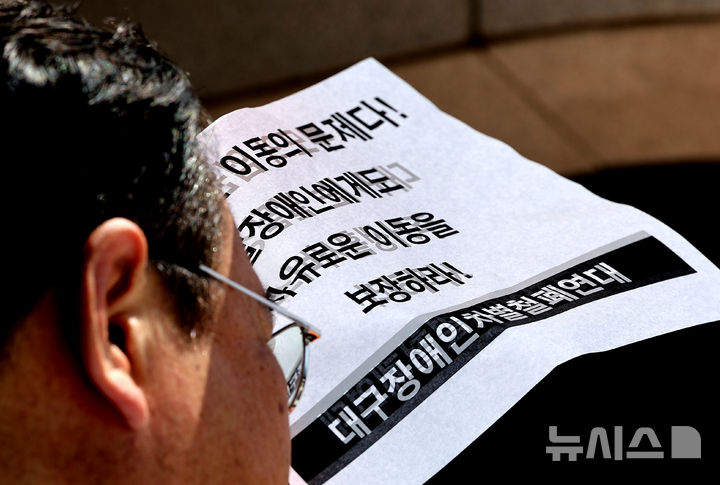 [대구=뉴시스] 이무열 기자 = 27일 대구 중구 대구시청 동인청사 앞에서 열린 대구시 장애인 권리보장 촉구 결의대회에서 대구장애인차별철폐연대가 지역장애인의 권리 보장을 촉구하고 있다. 2025.06.27. [email protected]