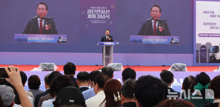 [인천=뉴시스] 전진환 기자 = 27일 오전 인천 서구 신검단중앙역에서 열린 인천도시철도 1호선 '검단연장선 개통기념식'에서 유정복 시장이 축사를 하고 있다.