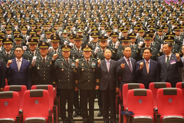 [서울=뉴시스] 27일 충북 괴산군 육군학생군사학교에서 열린 2025년 대한민국 육군장교 통합임관식에서 고창준 육군참모총장 직무대리와 신임장교들이 기념촬영을 하고 있다. (사진=육군 제공) 2025.06.27. [email protected] *재판매 및 DB 금지