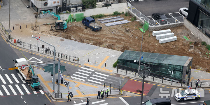 [서울=뉴시스] 김선웅 기자 = 27일 서울 서초구 교대역 인근에서 포크레인 작업 중 도시가스 배관이 파손되면서 가스가 역사 내부로 유입되는 사고가 발생해 경찰, 소방 당국이 현장을 수습하고 있다. 2025.06.27. [email protected]