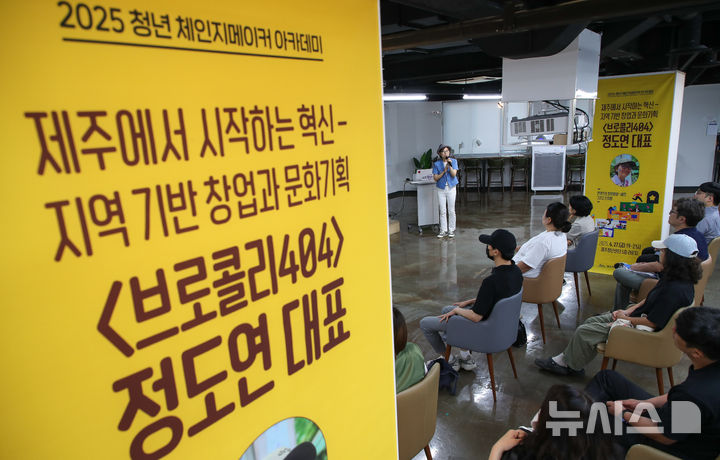 [제주=뉴시스] 우장호 기자 = 27일 오후 제주시 제주청년센터 5층 라운지에서 열린 '2025 제1회 청년 체인지메이커 아카데미'에서 정도연 브로콜리 404 대표가 '제주에서 시작하는 혁신-지역기반 창업과 문화기획'을 주제로 강연하고 있다.
