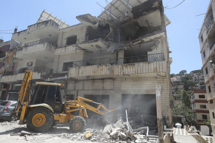 [나바티예=AP/뉴시스] 27일(현지 시간) 레바논 남부 나바티예에서 불도저 한 대가 이스라엘의 공습으로 파괴된 건물 잔해를 치우고 있다. 이스라엘군(IDF)은 친이란 무장정파 헤즈볼라가 재건을 시도한 대규모 지하 시설을 공습했다고 밝혔다. 레바논 국영통신은 IDF가 아파트를 공격해 1명이 숨지고 13명이 부상했다고 보도했다. 2025.06.28.
